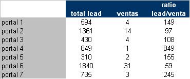 Os digo que supuestamente el más caro es el portal 2, el más barato es el portal 4, y el propio el 6. estos parámetros muy resumidos de muchas hojas de excel se dan mes tras mes en la misma proporción. hay canales que necesitan 60 lead para una venta y otros 850!!! pensáis que el más barato es barato de verdad? pensad en las horas que se pierden gestionando contactos de mala calidad!